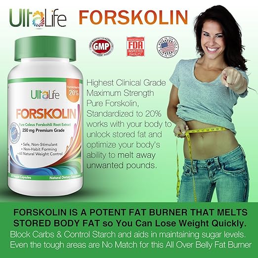 UltaLife Forskolin For  Contains 250mg COLEUS FORSKHOLII Root Extract standardized to 20% pure FORSKOLIN, which is the recommended maximum potency formula. Research suggests that FORSKOLIN stimulates the production of cyclic adenosine monophosphate (cAMP), which plays a role in several physiological and biochemical processes. cAmp is believed to regulate the metabolism of glycogen, sugar and fat